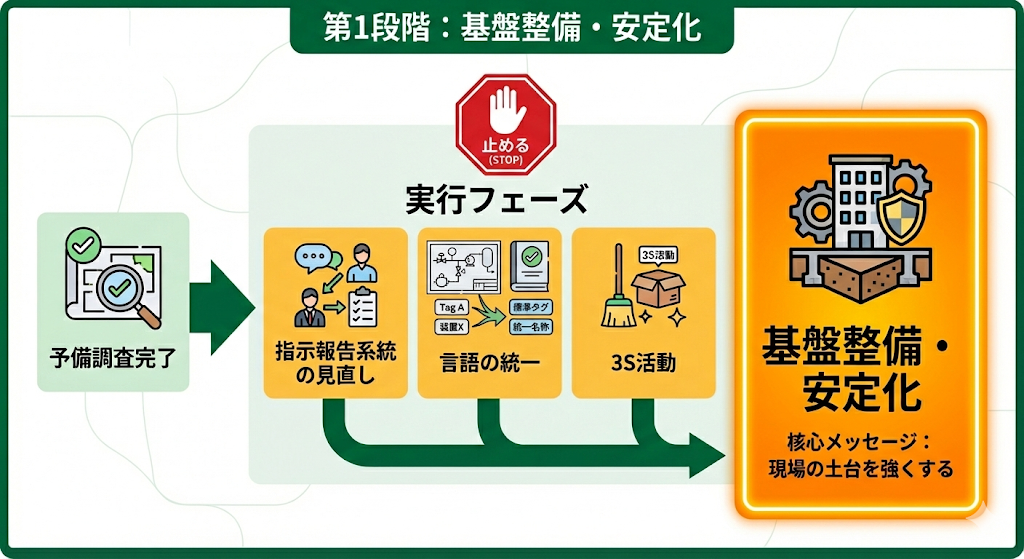 更に、これらを実現するために踏むべき手順が、「予備調査」「基盤整備・安定化」「標準化」「システム化」の4つのステップです。最終段階の「システム化」はあくまで結果であり、そこに至る過程で人の意識を変え、盤石な基盤を作ることこそが本質です。