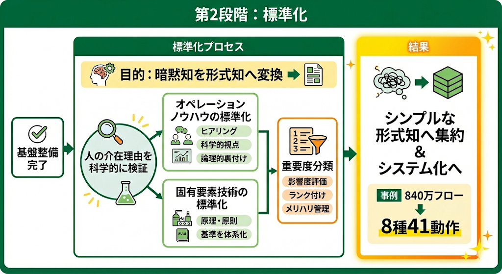 ここで強調しておきたいのは、ダイセルの成功は「AIが凄かったから」だけではないという点です。 泥臭い「ムダ・ロスの排除」と「標準化(基盤づくり)」があったからこそ、AIが機能しました。